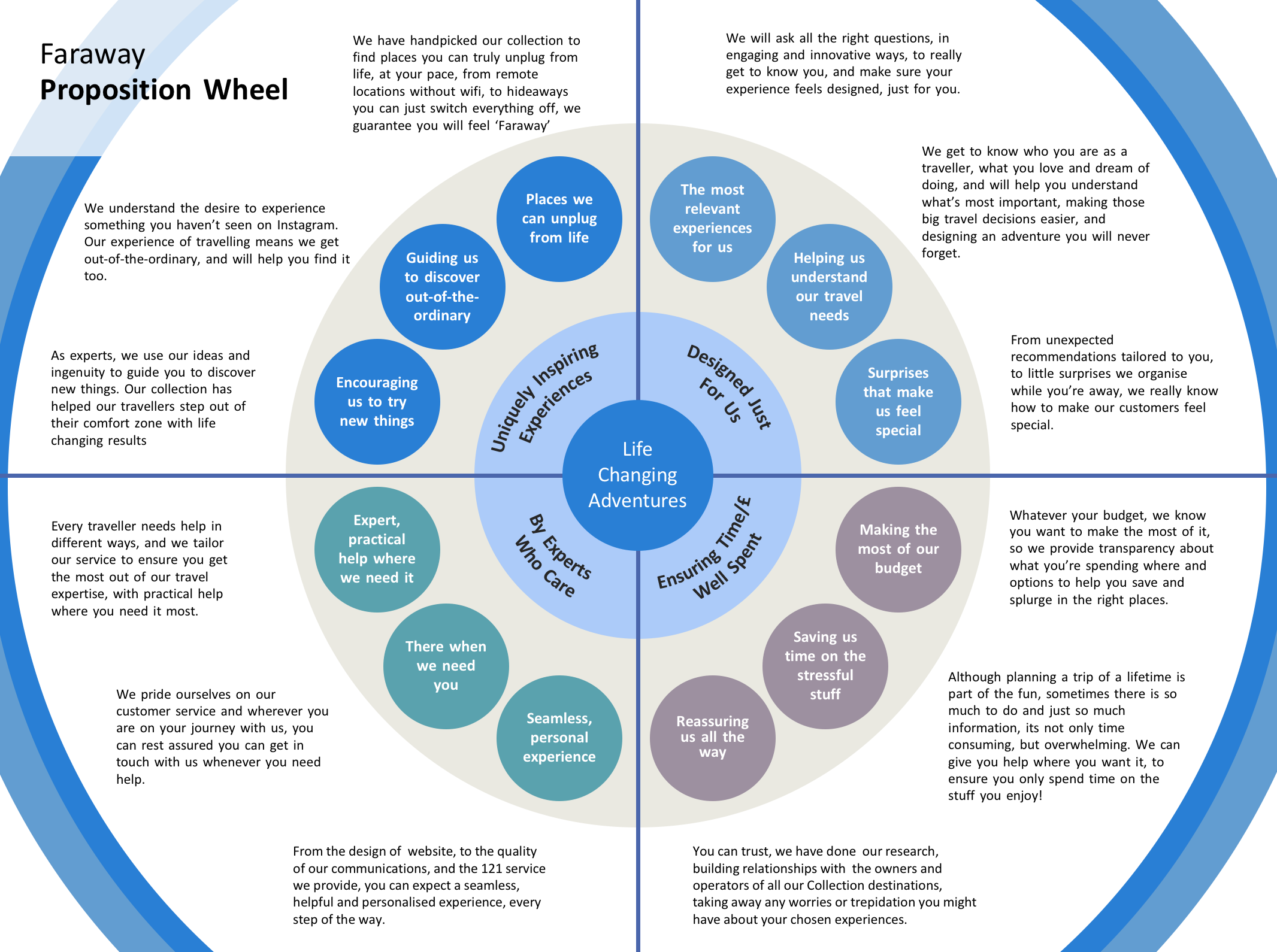 CMX can work with you to get back to basics, and rethink how your brand/service promise can help you deliver tangible value at every touchpoint and stage of the customer journey. Building a toolkit, including a proposition wheel can help guide decision making later on and release boundless new energy for coming up with new ideas that deliver the greatest impact to your customers/users.